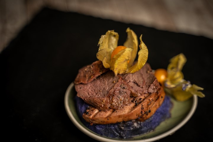 (Szarvasbélszín steak, füstölt libamájjal, lilaburgonya pürével)